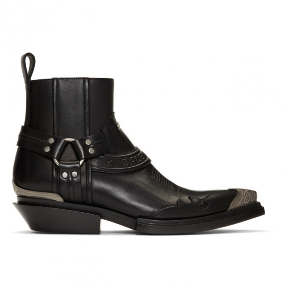 Balenciaga Black Santiag Harness Boots Hors stock Marque : Balenciaga Stylecode : 562603 WA921 Couleur : 1081 BLKNKL Genre : Homme Mets la main sur la Balenciaga Black Santiag Harness Boots auprès des meilleurs revendeurs de baskets du monde entier.